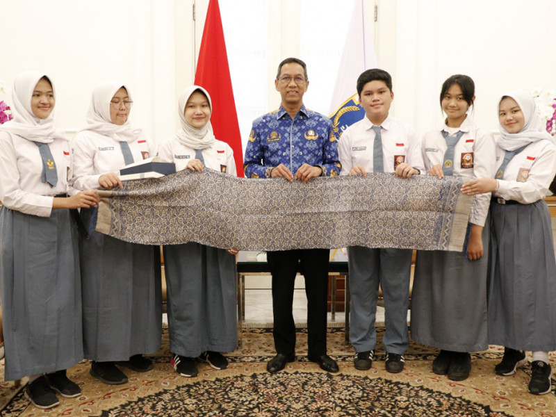 Penjabat (Pj) Gubernur DKI Jakarta, Heru Budi Hartono, Jumat (28/10), menerima kunjungan enam siswa SMA Negeri 81 Jakarta. Enam peserta didik tersebut terpilih sebagai perwakilan Indonesia di ajang Global Virtual Exchange berkat inovasinya mendaur ulang limbah daun nanas menjadi serat kain. (Foto: Mochamad Tresna Suheryanto/beritajakarta.id)