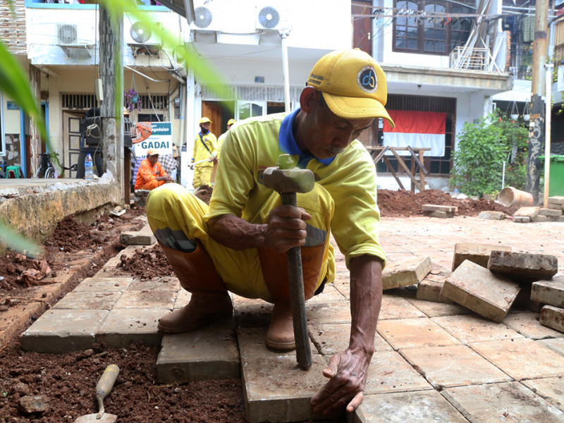 Petugas Satuan Pelaksana (Satpel) Bina Marga Kecamatan Menteng, Jakarta Pusat dibantu PPSU melakukan penataan lingkungan di Jalan Tambak II, RT 04/05, Kelurahan Pegangsaan. Penataan meliputi pemasangan paving block dan perbaikan tali air di areal seluas 36m². (Foto: Reza Hapiz/beritajakarta.id)