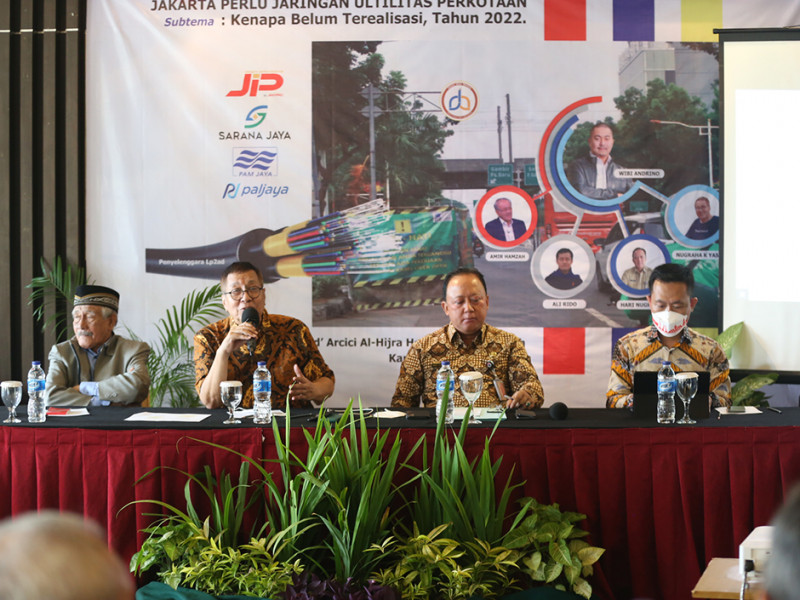 Lembaga Pemantau Penyimpangan Aparatur Daerah (LP2AD) mengadakan seminar bertajuk \"Jakarta Perlu Jaringan Utilitas Perkotaan\" di d\'Arcici Al-Hijra Hotel, Jakarta Pusat, Kamis (27/10). Seminar tersebut membahas payung hukum Rancangan Peraturan Daerah (Raperda) terkait penataan jaringan utilitas di Jakarta. Bertindak sebagai narasumber, Kepala Dinas Bina Marga DKI Jakarta, Hari Nugroho; Pemerhati Kebijakan Publik, Amir Hamzah; dan Citivitas Akademik Trisakti, Ali Rido. (Foto: Reza Hapiz/beritajakarta.id)
