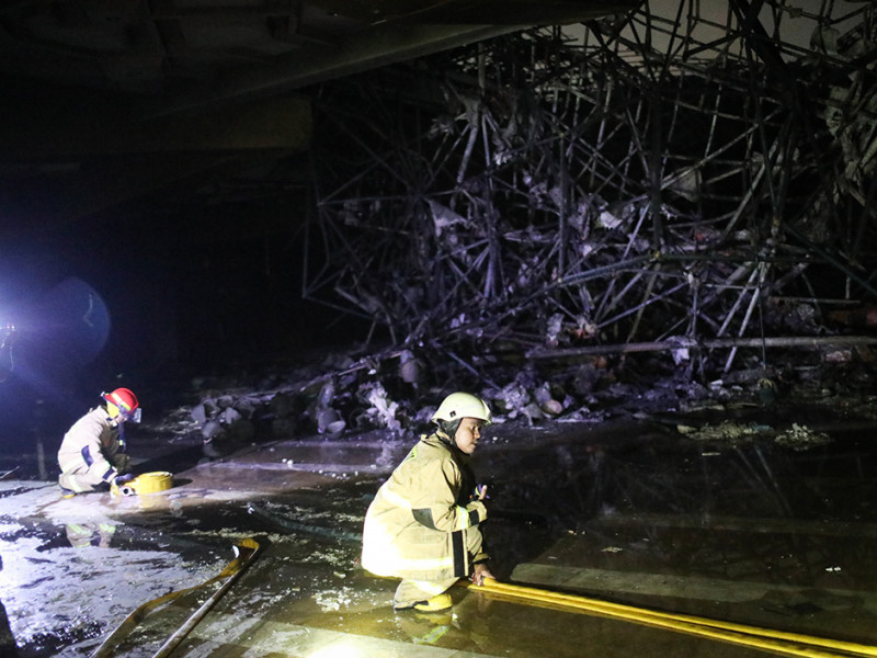 Petugas Dinas Penanggulangan Kebakaran dan Penyelamatan (Gulkarmat) DKI Jakarta memadamkan kebakaran kubah Masjid Jakarta Islamic Center (JIC) di Jalan Kramat Raya, Koja, Jakarta Utara, Rabu (19/10). Sebanyak 21 unit mobil pemadam kebakaran dan 90 personel dikerahkan untuk memadamkan api. Tidak ada korban jiwa maupun luka berat dalam kejadian ini. (Foto: Nugroho Sejati/beritajakarta.id)