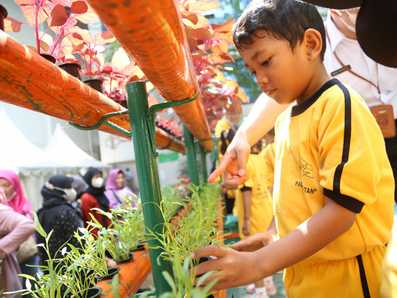 Sebanyak 15 murid Pendidikan Anak Usia Dini (PAUD) dari Petukangan Utara Pesanggrahan, Jakarta Selatan mengikuti Gerakan Menanam se-DKI Jakarta di Balkot Farm, Kompleks Balai Kota DKI Jakarta, Jakarta Pusat, Rabu (28/9). (Foto: Reza Hapiz/beritajakarta.id)