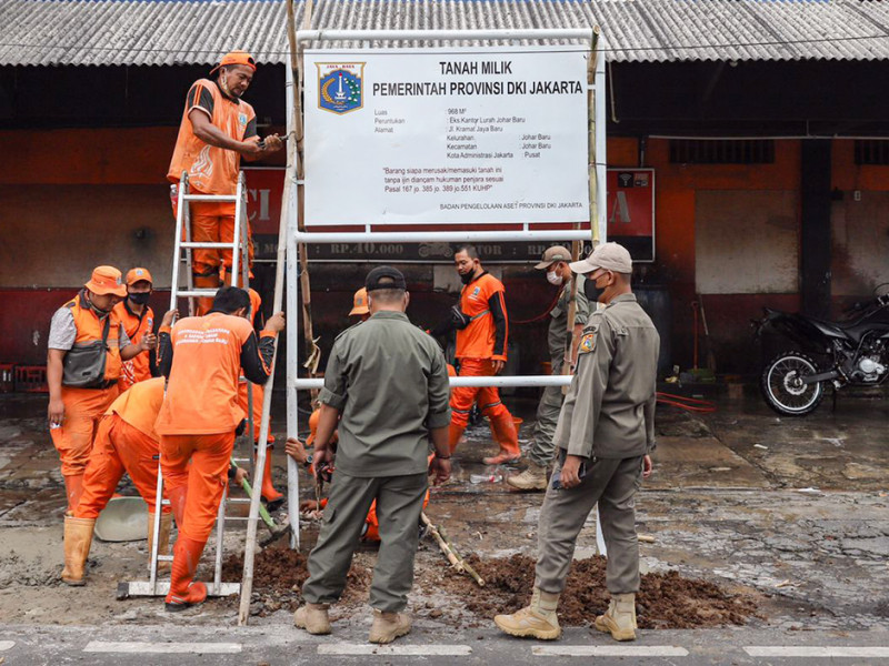 Pemerintah Kota (Pemkot) Jakarta Pusat melakukan pemasangan plang aset di lahan eks kantor Kelurahan Johar Baru, Jalan Kramat Jaya Baru, Kecamatan Johar Baru. Pemasangan plang aset dipimpin oleh Camat dan Sekcam Johar Baru, Nurhelmi Savitri dan Andre Pasaribu bersama puluhan personel gabungan Suku Badan (Suban) Pengelola Aset Kota Jakarta Pusat, Bagian Hukum Kota Jakarta Pusat, Satpol PP, Sudinhub, PPSU, jajaran tiga pilar, dan FKDM. (Foto: Mochamad Tresna Suheryanto/beritajakarta.id)