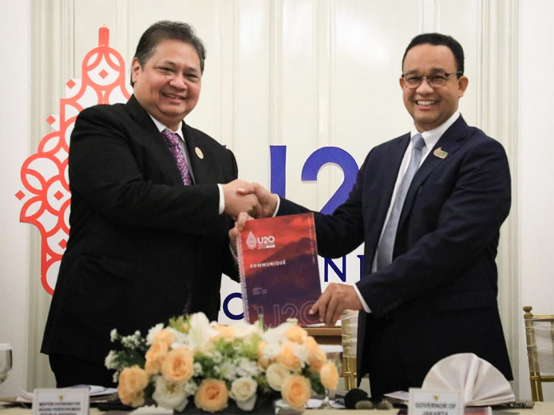 Gubernur DKI Jakarta sekaligus Co-chairs U20 2022, Anies Baswedan menyerahkan U20 Communique kepada Menteri Koordinator (Menko) Perekonomian Republik Indonesia, Airlangga Hartarto di Balai Kota DKI Jakarta, Gambir, Jakarta Pusat, Rabu (31/8). U20 Communique akan disampaikan kepada Presiden Joko Widodo untuk dibahas pada pertemuan KTT G20 di Bali. (Foto: Nugroho Sejati/beritajakarta.id)