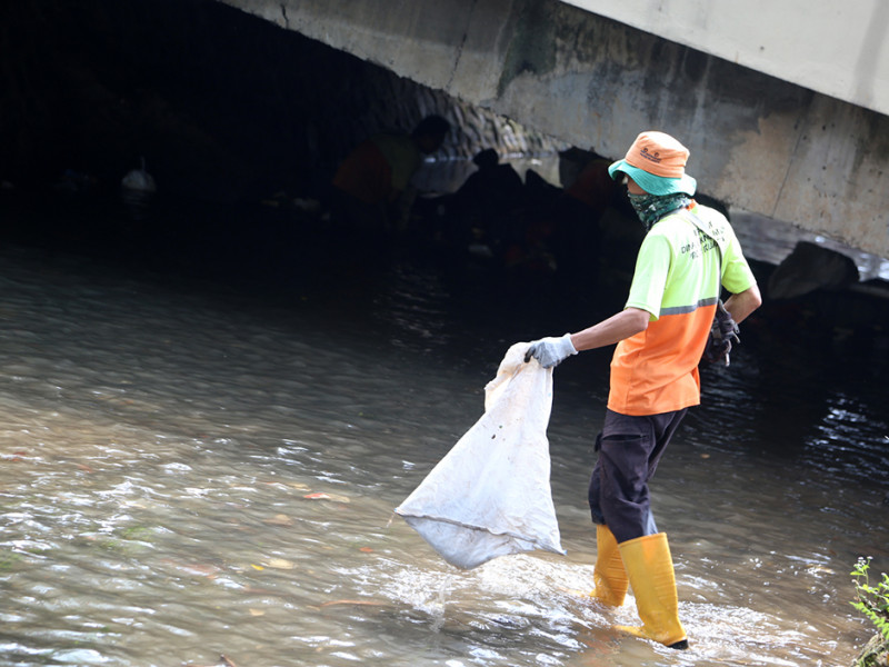 Unit Pelaksana Kebersihan (UPK) Badan Air, Dinas Lingkungan Hidup DKI Jakarta melakukan pengangkatan sampah di Kali Baru Barat, Jalan Prof Dr Soepomo, Tebet, Jakarta Selatan. Pembersihan dilakukan agar aliran air tetap lancar. (Foto: Reza Hapiz/beritajakarta.id)