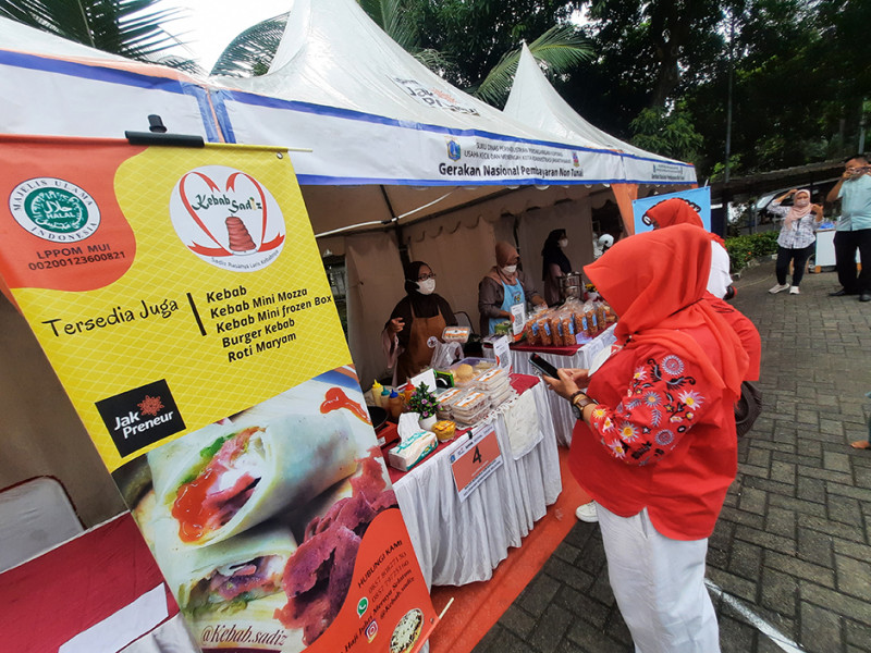Sebanyak 30 pelaku Usaha Mikro, Kecil dan Menengah (UMKM) binaan atau Jakpreneur mengikuti kegiatan Bazar Merdeka di halaman Masjid Al Hurriyyah, Jalan Kembang Mulya, Puri Indah, Komplek SPS Blok D, RT 04/03, Kelurahan Kembangan Selatan, Kembangan, Jakarta Barat, Jumat (12/8). Bazar ini menampilkan berbagai macam produk kuliner, minuman, kerajinan tangan dan fesyen. (Foto: Reza Hapiz/beritajakarta.id)
