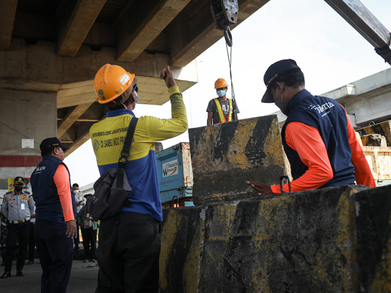 Petugas Suku Dinas Perhubungan (Sudinhub) Jakarta Timur melakukan penutupan akses Jembatan Kapin di Jalan Laksamana Malahayati, Pondok Kelapa, Duren Sawit, Jakarta Timur, Kamis (28/7). Penutupan dengan beton MCB (movable concrete barrier) itu untuk memperlancar arus lalu lintas di lokasi tersebut. (Foto: Nugroho Sejati/beritajakarta.id)