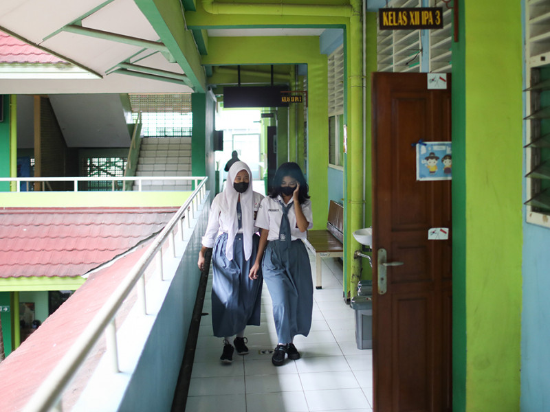 Para siswa mulai mengikuti kegiatan belajar mengajar (KBM) pada tahun ajaran baru 2022/2023 di SMA Negeri 70, Jalan Bulungan, Kelurahan Kramat Pela, Kebayoran Baru, Jakarta Selatan, Senin (11/7). Dinas Pendidikan (Disdik) DKI Jakarta memulai kalender akademik tahun 2022/2023 pada tanggal 11 Juli 2022. Pada tiga hari pertama pelaksanaan, kegiatan diisi dengan Masa Pengenalan Lingkungan Sekolah (MPLS) bagi peserta didik baru . (Foto: Nugroho Sejati/beritajakarta.id)
