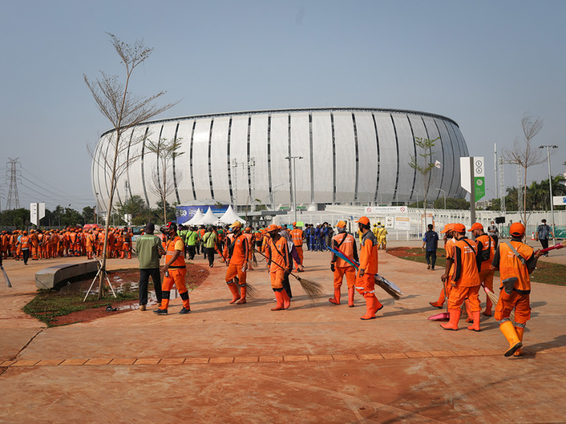 Petugas gabungan dari Suku Dinas Penanggulangan Kebakaran dan Penyelamatan (Gulkarmat), Pertamanan dan Hutan Kota, Sumber Daya Air, Bina Marga, PPSU, Satpol PP dan Perhubungan melakukan kerja bakti kawasan Jakarta International Stadium (JIS), Jakarta Utara, Jumat (8/7). Aksi bersih-bersih tersebut diawali apel bersama yang dipimpin Asisten Pembangunan dan Lingkungan Hidup Jakarta Utara, Wawan Budi Rohman. (Foto: Nugroho Sejati/beritajakarta.id)