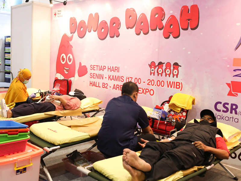 Sejumlah pengunjung Pekan Raya Jakarta (PRJ) mengikuti aksi donor darah di Hall B2, JIExpo Kemayoran, Jakarta Pusat, Rabu (29/6). Gerai donor darah di PRJ buka setiap hari Senin-Kamis mulai pukul 17.00-20.00. (Foto: Nugroho Sejati/beritajakarta.id)
