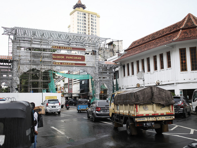 Sejumlah pekerja membangun gapura di Jalan Pancoran, Kecamatan Taman Sari, Jakarta Barat, Kamis (9/6). Pembangunan gapura tersebut bertujuan mempercantik kawasan Chinatown (Pecinan) Glodok Pancoran. (Foto: Nugroho Sejati/beritajakarta.id)