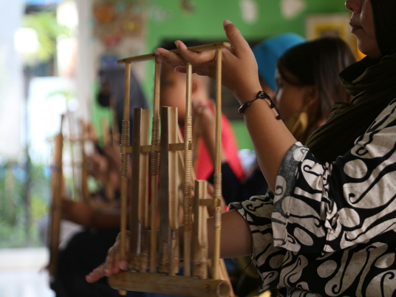 Suku Dinas Kebudayaan Jakarta Pusat mengadakan pelatihan seni musik angklung di Ruang Publik Terpadu Ramah Anak (RPTRA) Intiland Teduh, Jalan Karet Pasar Baru Barat VII, Karet Tengsin, Tanah Abang. Dalam pelatihan ini, para peserta diberikan edukasi tentang sejarah hingga teknik memainkan alat musik tradisional angklung. (Foto: Mochamad Tresna Suheryanto/beritajakarta.id)
