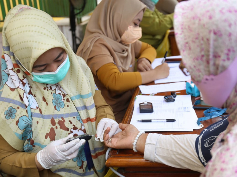 Puskesmas Kecamatan Setiabudi menggelar layanan pemeriksaan kesehatan penyakit tidak menular (PTM) di Pasar Karbela atau Pasar Mencos, Kelurahan Karet, Selasa (17/5). Layanan kesehatan yang diberikan secara gratis itu disambut antusias sejumlah warga dan pedagang. Adapun pemeriksaan yang dilakukan meliputi riwayat faktor resiko PTM, antopometri (berat dan tinggi badan), tekanan darah, gula darah, kolesterol, asam urat serta edukasi gizi dan aktivitas fisik. (Foto: Reza Hapiz/beritajakarta.id)