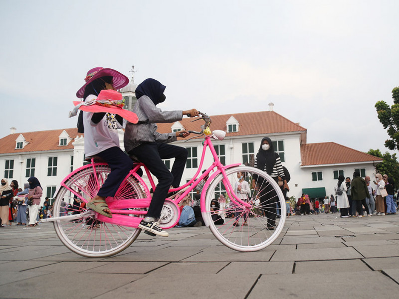 Kawasan Wisata Kota Tua Jakarta menjadi primadona destinasi wisata saat libur cuti bersama Lebaran 1443 Hijriah, Sabtu (7/5). Pengunjung memadati kawasan Kota Tua tidak hanya untuk sekedar berwisata tetapi juga berkumpul bersama keluarga dan kerabat lainnya. Unit Pengelola (UP) kawasan Kota Tua membatasi jumlah pengunjung yang masuk sekitar 75 persen dari kapasitas atau sekitar 1000 orang dan akan di tutup sementara jika sudah melebihi batas maksimal. Total pengunjung Kota Tua hingga pukul 15.00 WIB mencapai 9.770 orang. (Foto: Mochamad Tresna Suheryanto/beritajakarta.id)
