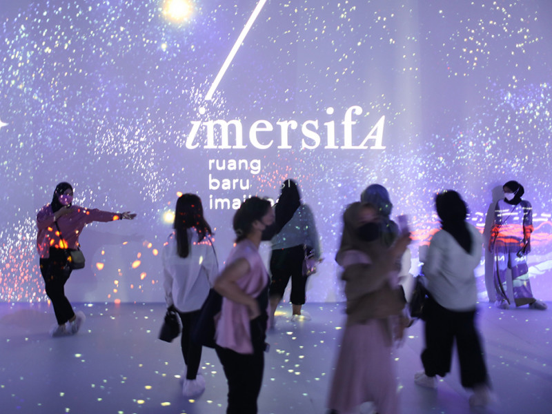 Pengunjung menyaksikan pertunjukan tiga dimensi dalam pameran Ruang ImersifA \"Ruang Baru Imajinasi\" di Museum Nasional, Gambir, Jakarta Pusat, Kamis (14/4). Fasilitas baru di Museum Nasional tersebut menyuguhkan lini masa dari zaman prasejarah Indonesia hingga masa kini. Pertunjukan yang berada di Gedung A itu berlangsung selama 30 menit yang diproyeksikan dengan sudut 360 derajat. (Foto: Nugroho Sejati/beritajakarta.id)