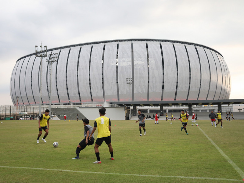 Tim Indonesia All Star U-20 menjalani latihan di lapangan latih Jakarta Indonesia Stadium (JIS), Tanjung Priok, Jakarta Utara, Sabtu (9/4). Latihan ini dalam rangka persiapan jelang turnamen International Youth Championship (IYC) 2021 yang berlangsung pada 13-19 April 2022 di JIS. Turnamen tersebut diikuti oleh empat tim, yakni Indonesia All Star U-20, Bali United U-19, Atletico Madrid U-18, dan Barcelona U-18. (Foto: Nugroho Sejati/beritajakarta.id)