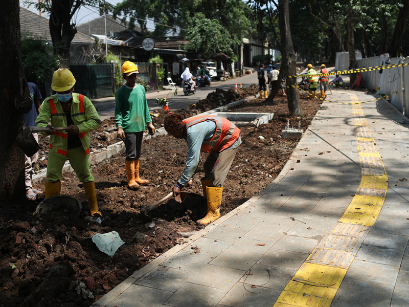 Sejumlah pekerja melakukan revitalisasi jalur pedestrian di sekeliling Tebet Eco Garden, Jalan Tebet Timur Raya, Tebet, Jakarta Selatan, Senin (4/4). Revitalisasi dilakukan untuk memberikan kenyamanan pejalan kaki sekaligus meningkatkan estetika kawasan Tebet Eco Garden. Pengerjaan ditargetkan selesai dalam waktu sepekan ke depan. (Foto: Nugroho Sejati/beritajakarta.id)