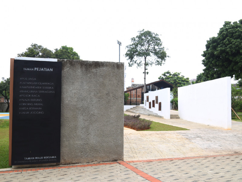 Upaya menambah keberadaan taman di ibu kota terus dilakukan Pemerintah Provinsi (Pemprov) DKI Jakarta. Selain berfungsi sebagai ruang terbuka hijau (RTH), keberadaan taman juga dapat menjadi sarana perkembangan dan pertumbuhan kejiwaan anak-anak. Salah satu RTH yang rampung dibangun pada 2021 yakni Taman Maju Bersama (TMB) Pejatian di Jalan Pasar Minggu No 8/33A, RT 02/05, Kelurahan Pejaten Barat, Kecamatan Pasar Minggu, Jakarta Selatan. Taman yang mengusung konsep Betawi ini dilengkapi beragam fasilitas pendukung yang bisa dimanfaatkan masyarakat dalam melakukan sejumlah aktivitas. (Foto: Reza Hapiz/beritajakarta.id)