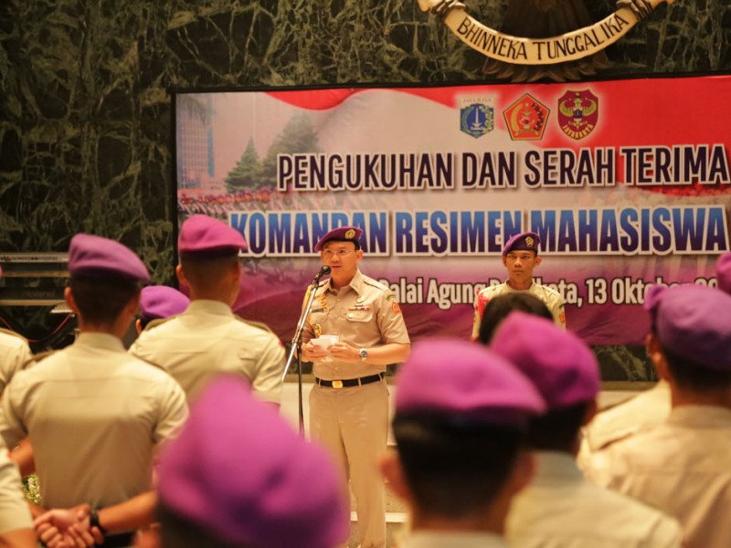 Raden Umar dikukuhkan sebagai Komandan Resimen Mahasiswa Jayakarta Periode 2015–2018 menggantikan Lukman Hakim. Prosesi pengukuhan dilakukan Gubernur DKI Jakarta, Basuki Tjahaja Purnama di Balai Kota DKI Jakarta, Selasa (13/10/2015). Turut hadir menyaksikan prosesi serah terima jabatan, Kepala Badan Kesatuan bangsa dan Politik Provinsi DKI Jakarta, Ratiyono serta Kepala Dinas Olahraga dan Pemuda Provinsi DKI Jakarta, Firmansyah Wahid.(Foto: Reza / Beritajakarta.com)