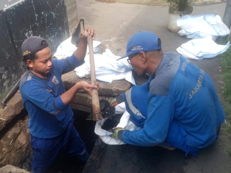 Pasukan Biru Satuan Pelaksana Sumber Daya Air (SDA) Kecamatan Cakung, Jakarta Timur dan petugas Penanganan Prasarana dan Sarana Umum (PPSU) setempat dikerahkan untuk melakukan pengerukan crossing saluran di Jalan Raya Cakung-Cilincing (Cacing), RT 09/RW 08, Kelurahan Cakung Barat.