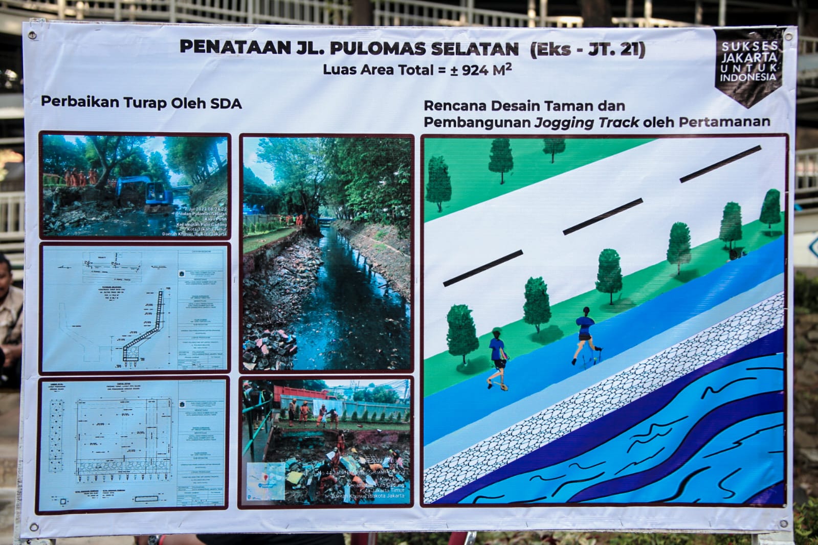 Selain itu, area tersebut juga akan dilengkapi fasilitas untuk menunjang aktivitas warga, seperti jogging track. "Untuk jogging track sedang ditata di dekat kali. Jogging track dibangun agar masyarakat bisa memakainya untuk olahraga, karena setiap hari Sabtu dan Minggu jalan ini ramai digunakan car free day," ujar Pj. Gubernur Heru.
