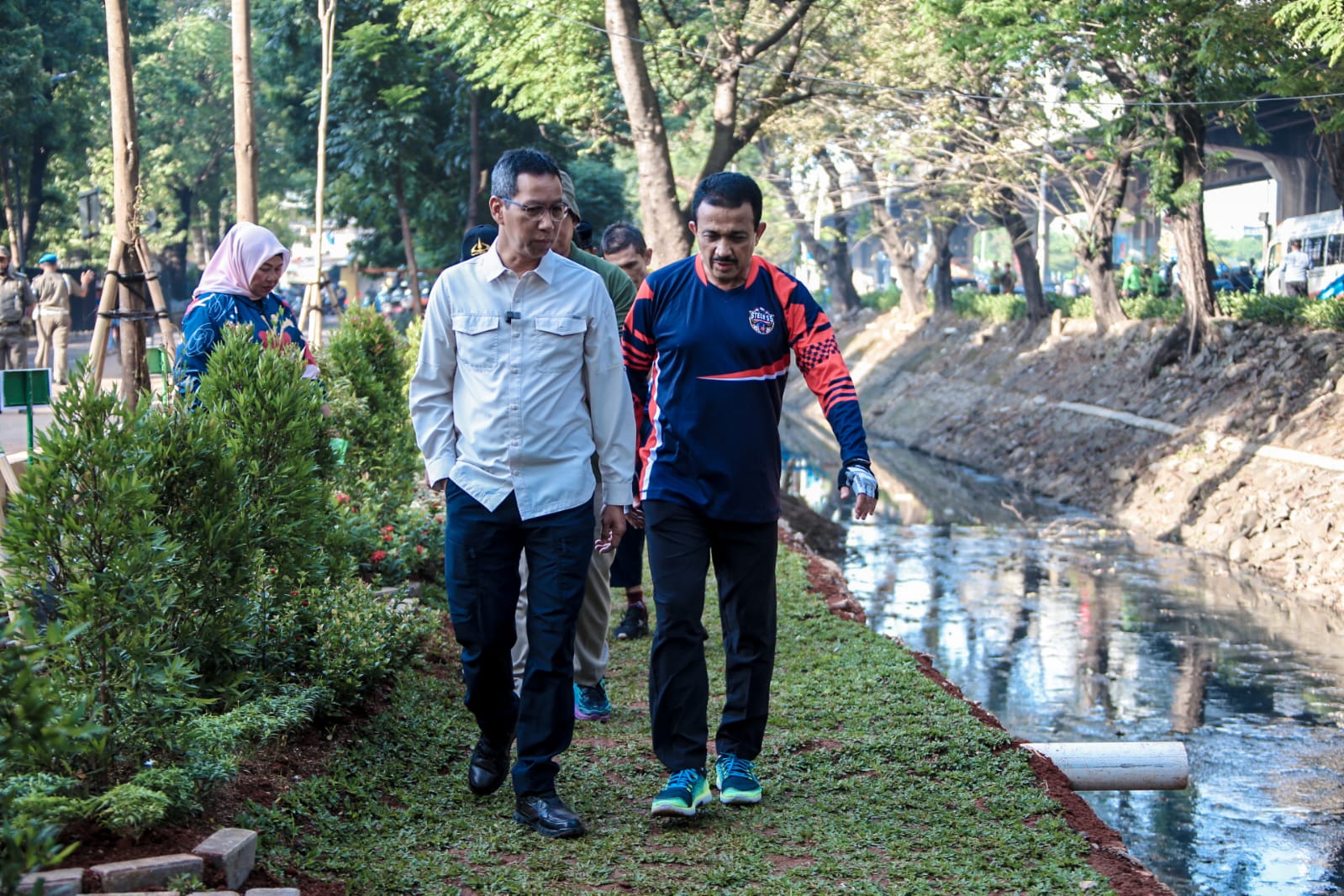 “Terima kasih dukungan masyarakat, Lembaga Musyawarah Kelurahan (LMK), dan warga di sekitar sini yang telah membantu melakukan penghijauan dan pengembalian area-area di sepanjang saluran PHB IKIP sehingga bisa hijau kembali,” terang Pj. Gubernur Heru.