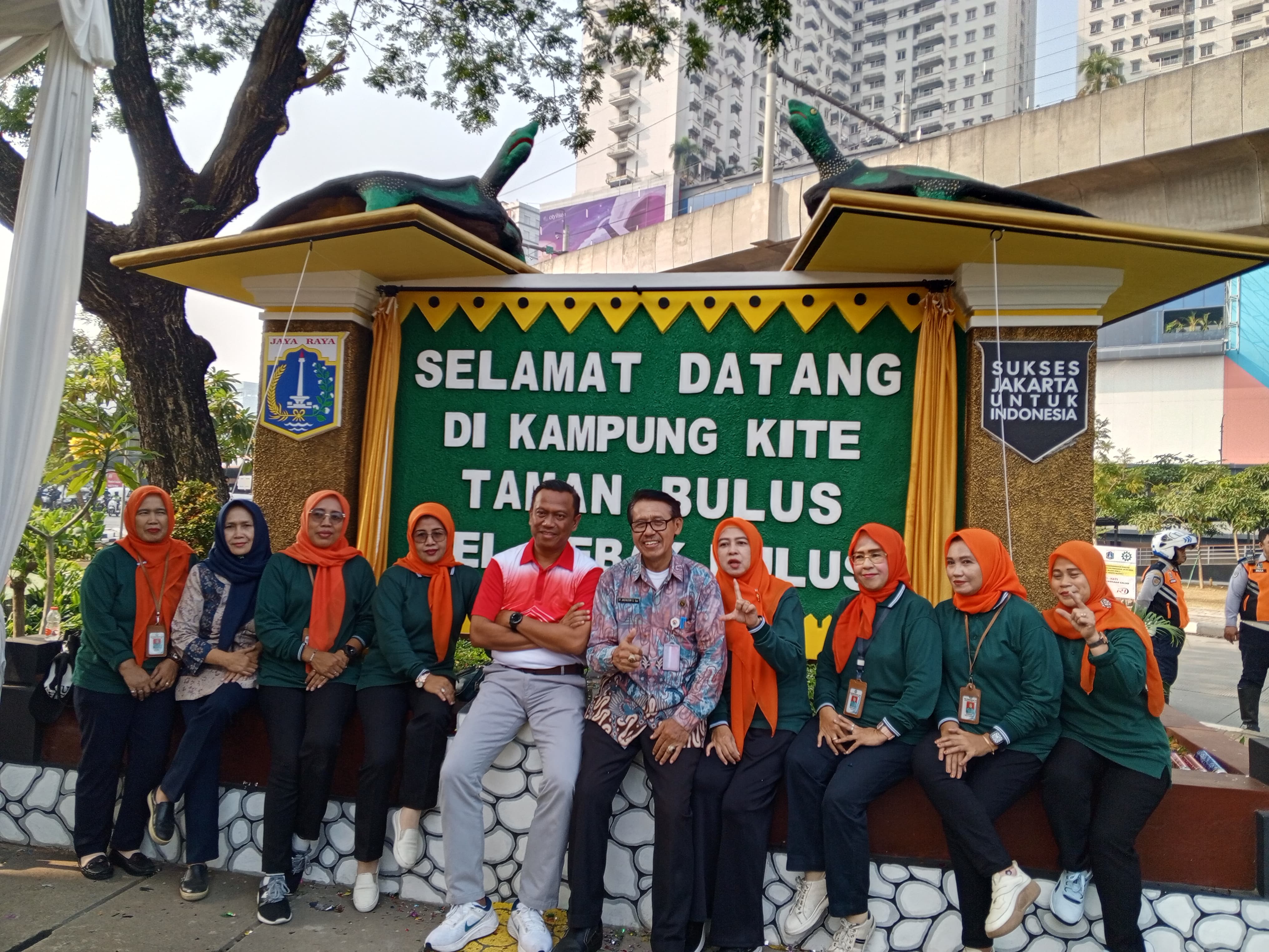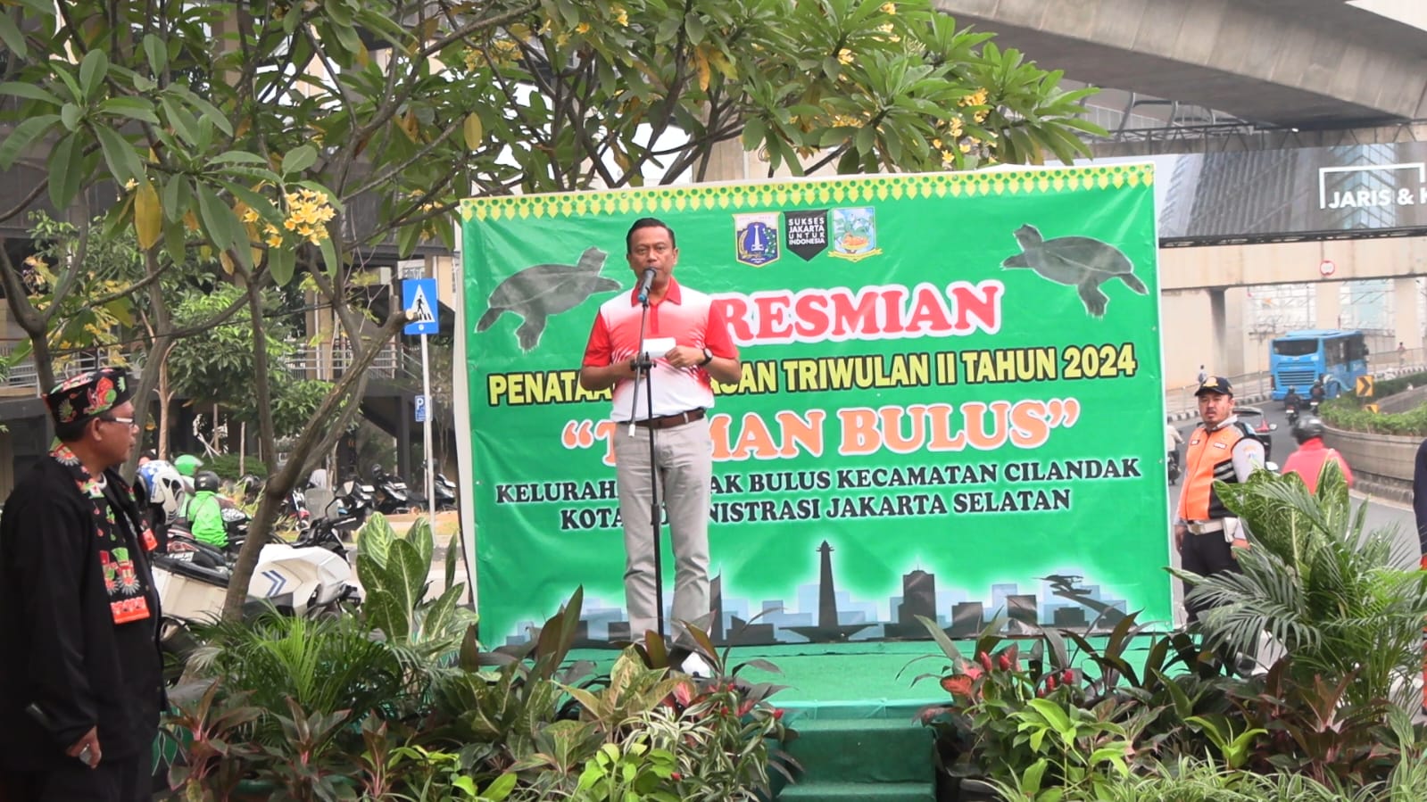 Walikota Administrasi Jakarta Selatan, Munjirin meresmikan penataan kawasan Triwulan II di wilayah Kelurahan Lebak Bulus, di Jalan RA Kartini, Kamis (1/8). Penataan dilakukan dengan membangun Tugu Selamat Datang berupa patung hewan Bulus yang mencirikan wilayan Lebak Bulus.
